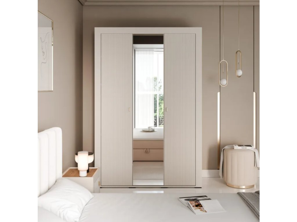 Šatníková skriňa BOXTON so zrkadlom je štýlový a funkčný kus nábytku, ktorý kombinuje priestranný úložný priestor s praktickým zrkadlom pre jednoduché každodenné používanie.