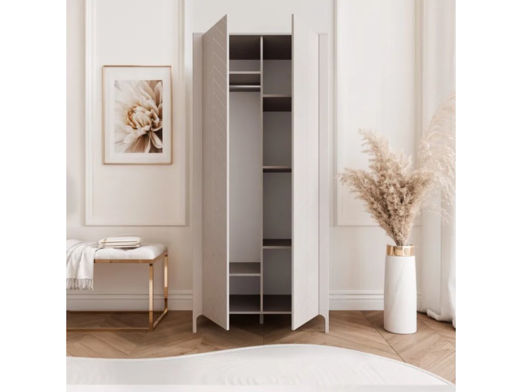Táto priestranná šatníková skriňa je perfektným riešením pre tých, ktorí hľadajú funkčný a elegantný spôsob uskladnenia oblečenia a doplnkov. Vďaka priestoru na zavesenie, ktorý je ideálny na dlhšie odevy, ako sú kabáty, bundy alebo šaty, budete mať všetko prehľadne a ľahko dostupné. Štyri priestranné police sú ideálne na uloženie zloženého oblečenia, doplnkov alebo ozdobných krabíc, zatiaľ čo ďalší priestor v spodnej časti pojme topánky, tašky alebo iné predmety dennej potreby. Závesná tyč zaisťuje jednoduché zavesenie a systém tlmeného zatvárania zaisťuje plynulé a tiché zatváranie dvierok, čím dodáva pohodlie a eleganciu.