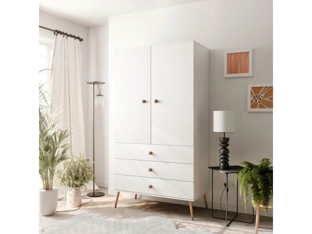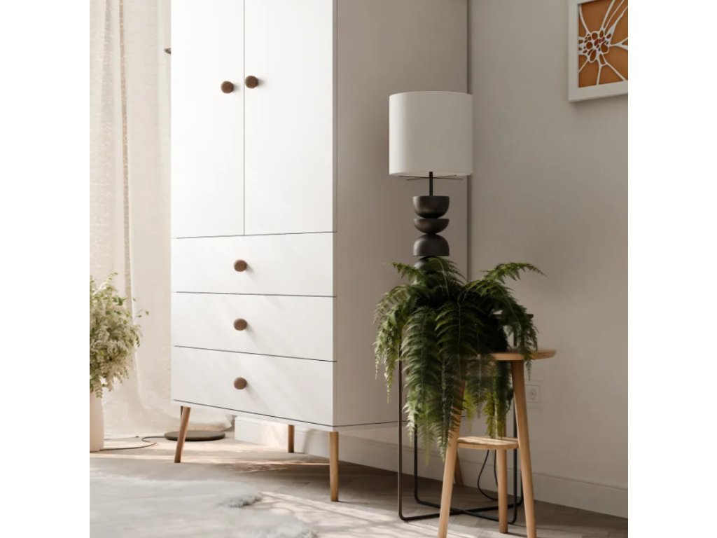 Šatníková skriňa VALERIA je dostupná v módnych pastelových farbách , vďaka čomu sa ľahko hodí do rôznych interiérových štýlov – od moderných a minimalistických až po útulné a elegantné priestory. Nohy z masívneho dreva nielenže umocňujú štýlový vzhľad nábytku, ale tiež zaisťujú štrukturálnu stabilitu a uľahčujú udržiavanie čistoty priestoru pod skriňou.
