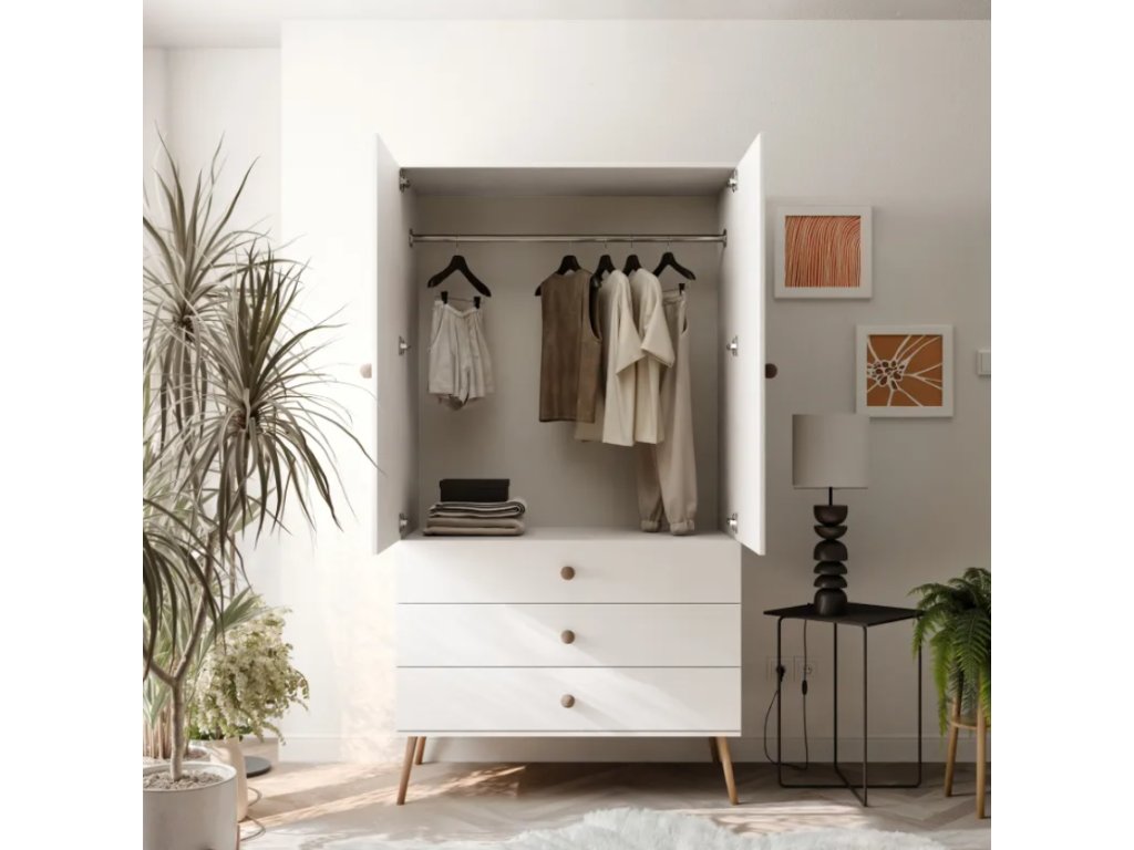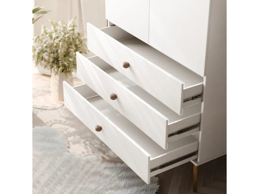 Skriňa je vybavená tromi priestrannými zásuvkami , ktoré umožňujú pohodlné uloženie spodnej bielizne, doplnkov a malých kusov šatníka. Okrem toho je skriňa vybavená pevnou vešiakovou tyčou , ktorá poskytuje dostatok priestoru na košele, šaty a bundy. Výsuvy zásuviek GTV zaisťujú plynulé a tiché zatváranie, čím výrazne zlepšujú pohodlie každodenného používania.
