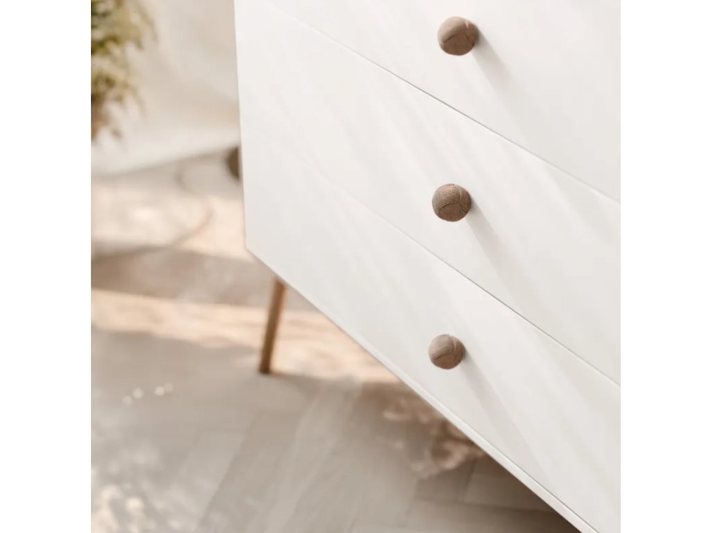 Korpus a predná časť skrinky sú vyrobené z odolnej 18 mm laminovanej dosky , čo zaisťuje štrukturálnu stabilitu, trvácnosť a odolnosť voči mechanickému poškodeniu a každodennému opotrebovaniu. Štýlové úchytky z pravého lana dopĺňajú dizajn , dodávajú nábytku prírodný nádych a jedinečný, vzdušný vzhľad.