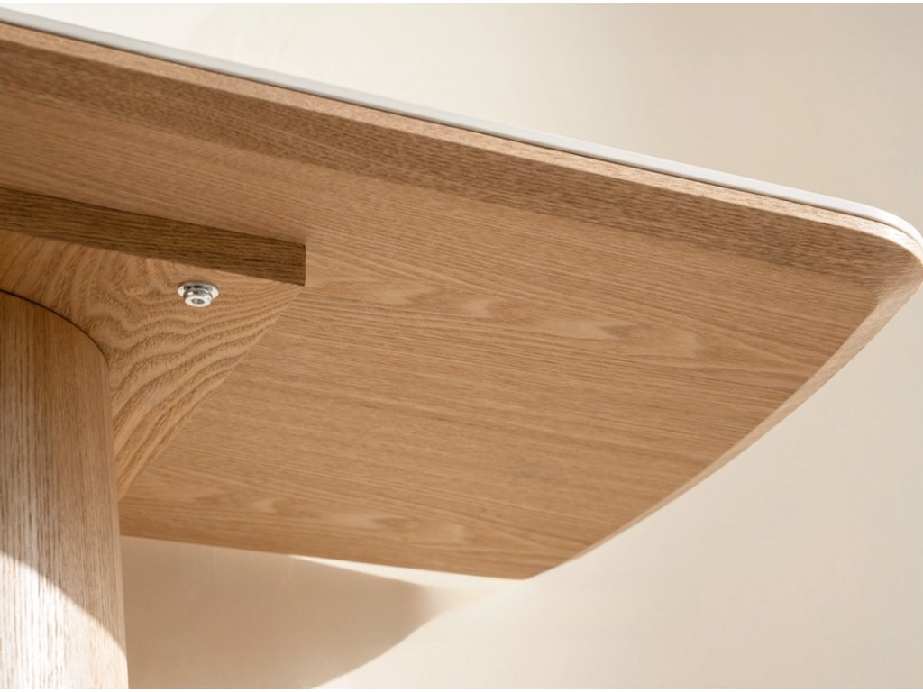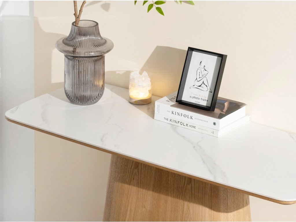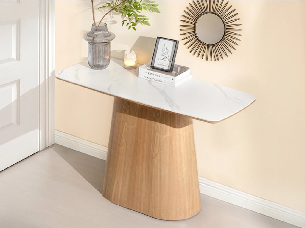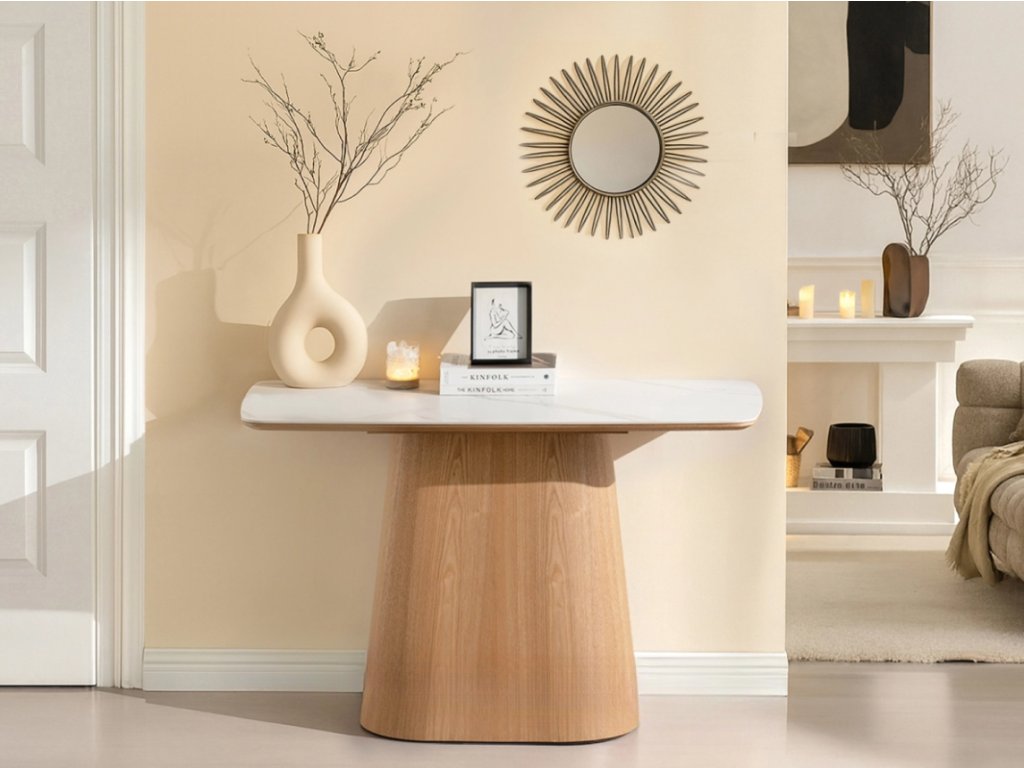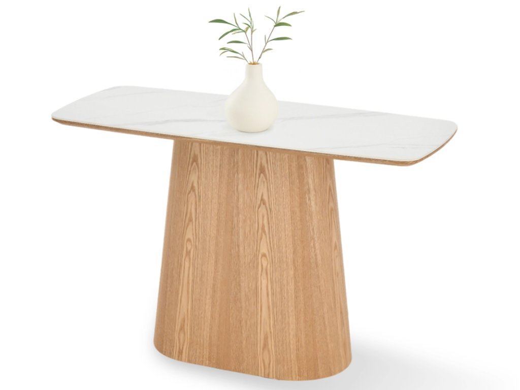Konzolový stolík JAMIE vyniká predovšetkým svojou obdĺžnikovou keramickou doskou so zaoblenými hranami , čo zaisťuje bezpečnosť a pohodlie pri používaní. Centrálna, kužeľovitá dubová základňa zaručuje stabilitu a pevnosť, vďaka čomu je stolík trvácny a odolný voči každodennému používaniu. Vďaka svojim kompaktným rozmerom je konzolový stolík ideálny do priestranných aj menších miestností a ponúka praktický priestor na dekorácie alebo predmety dennej potreby . Táto kombinácia funkčnosti a štýlu zvýši pohodlie vášho interiéru