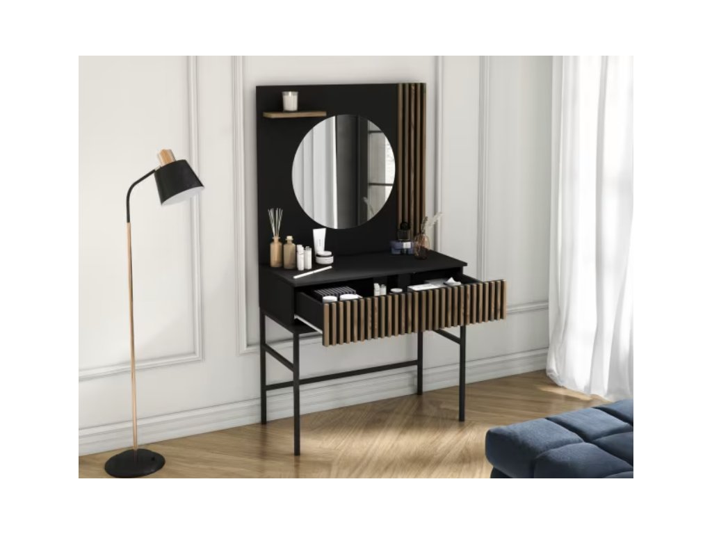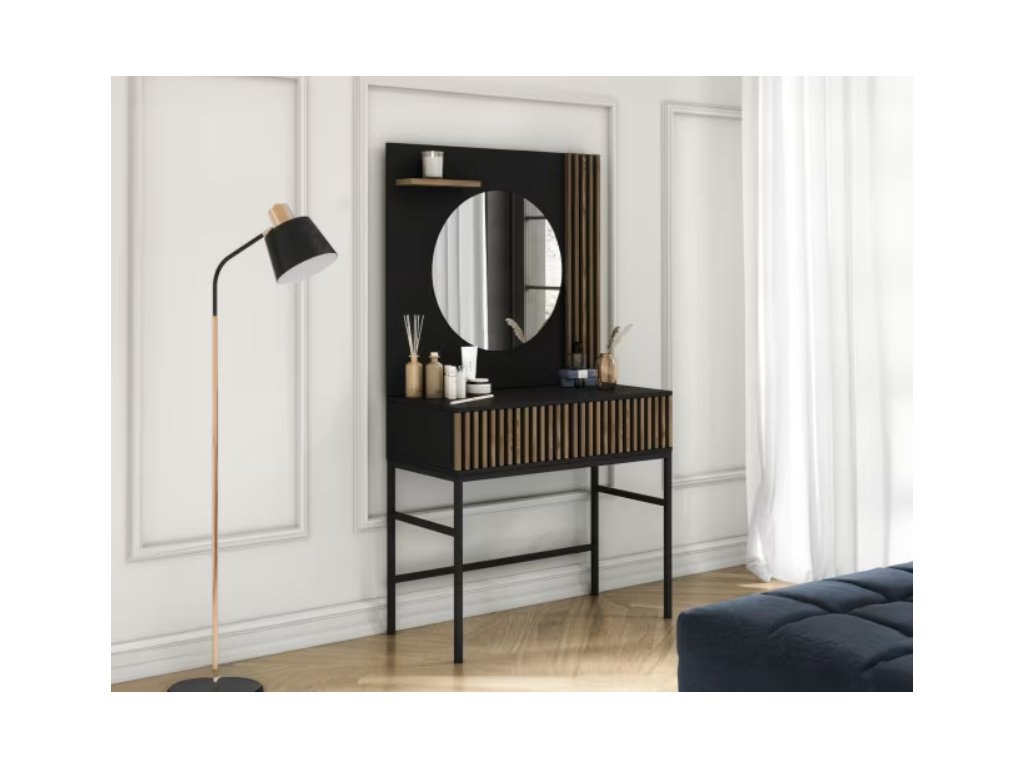 Celý toaletný stolík ALDEN je zachovaný v elegantnej kombinácii matnej čiernej a remeselného duba, čo mu dodáva jedinečné čaro. Táto farebná schéma sa perfektne hodí k rôznym štýlom interiérového dizajnu a vytvára harmonickú atmosféru. ALDEN je toaletný stolík, ktorý slúži nielen ako miesto na prípravu, ale je aj dekoratívnym prvkom vo vašej izbe. Jeho praktické zásuvky a dizajnérska úprava vám spríjemnia každodenné rituály starostlivosti.