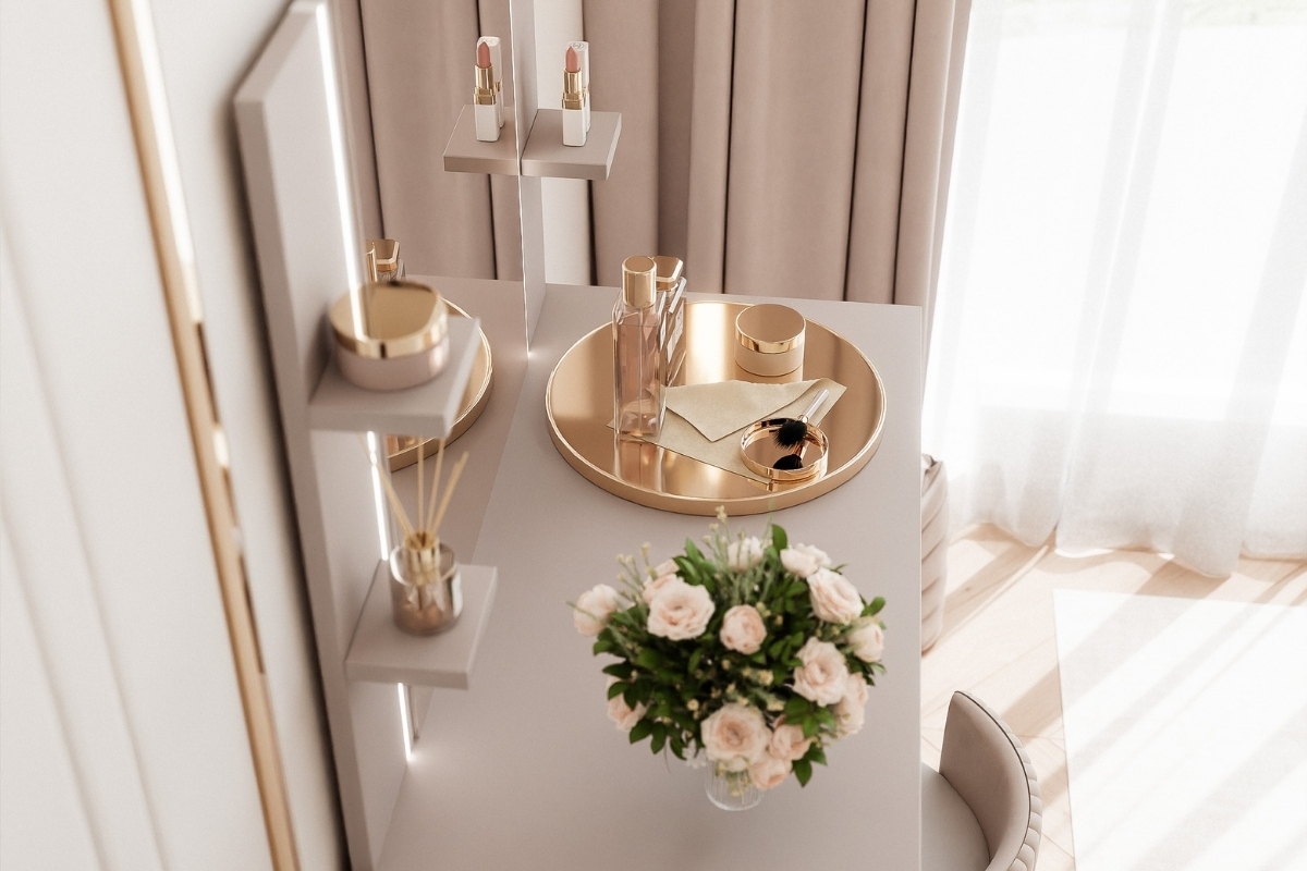 Tip dizajnéra: Neutrálny kašmírový odtieň krásne vynikne s čiernymi kovovými doplnkami a teplým drevom. Doplňte stolík okrúhlym pufom a úzkou vázičkou - vytvoríte harmonický beauty kútik, ktorý nepôsobí ťažkopádne ani v menšej spálni.