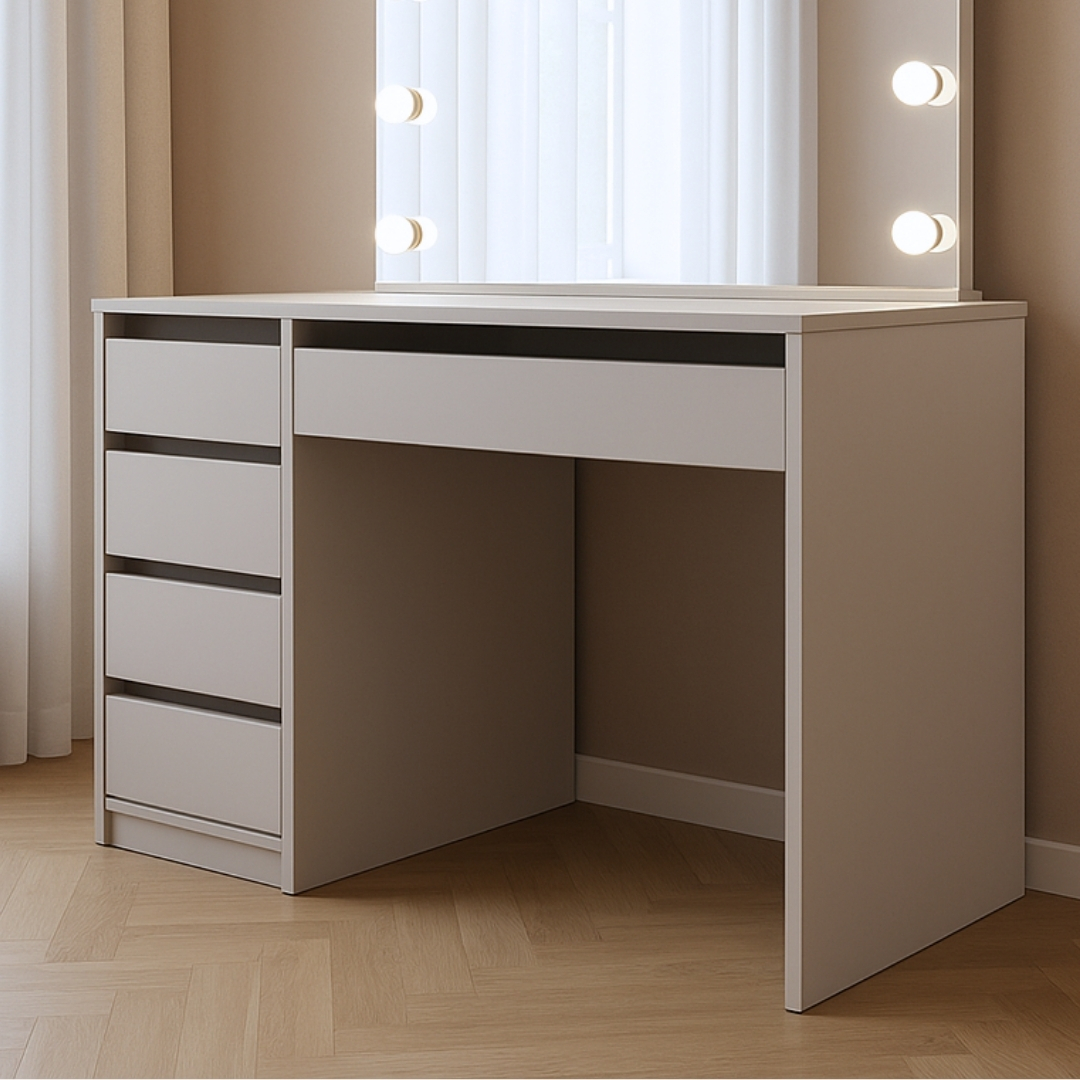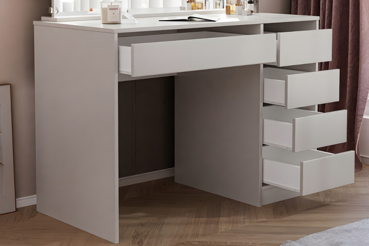 Štýlový toaletný stolík INEZ MINI s 5 zásuvkami, veľkým zrkadlom a jemným LED svetlom. Elegantné riešenie aj do menšieho priestoru.