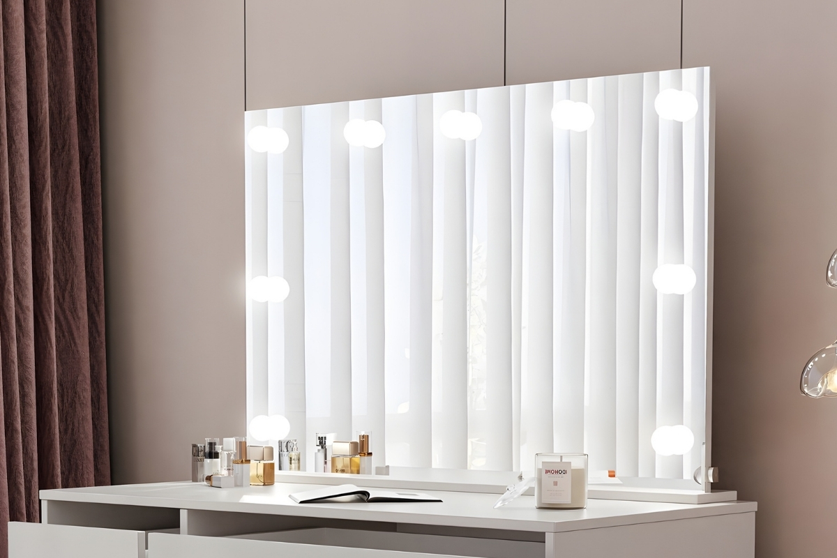 - Veľké zrkadlo s LED osvetlením (9 žiaroviek) poskytuje rovnomerné svetlo na líčenie aj starostlivosť o pleť.