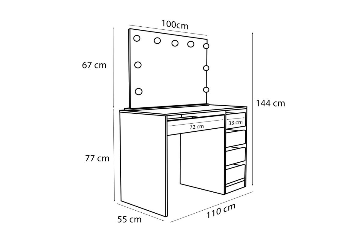 INEZ MINI vytvorí praktický beauty kútik aj v menšom priestore. Päť zásuviek udrží poriadok v kozmetike, zrkadlo s LED osvetlením uľahčí presné líčenie a vďaka šírke 110 cm môže stolík poslúžiť aj ako pracovná stanica na notebook.
