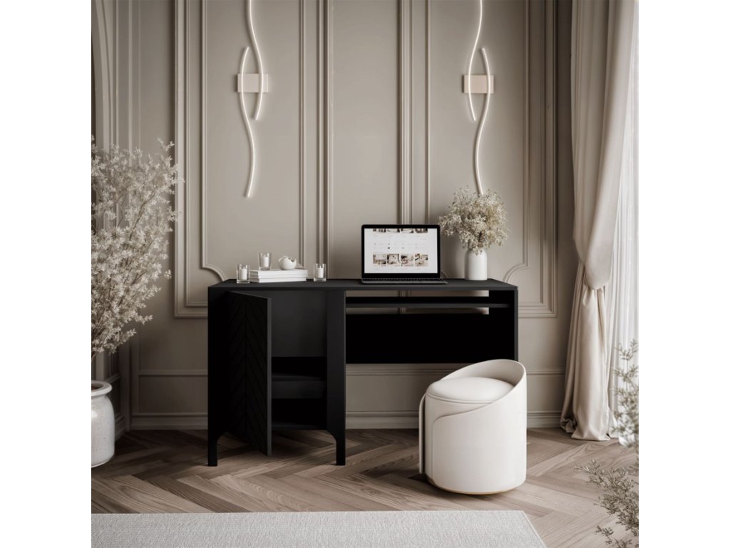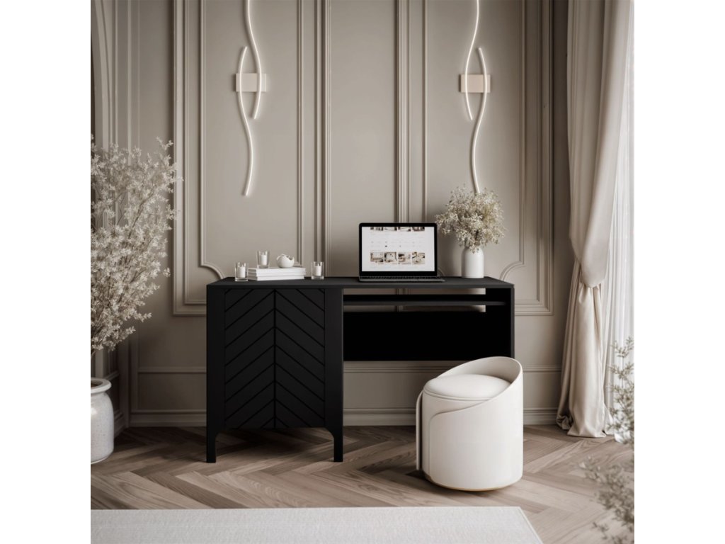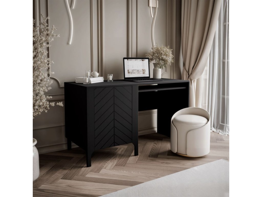 Tento elegantný, minimalistický písací stôl s ozdobnou prednou časťou v tvare rybej kosti a vstavaným úložným priestorom kombinuje funkčnosť s moderným štýlom. K dispozícii je v dvoch farebných prevedeniach – klasickej čiernej a decentnej kašmírovej – a perfektne sa hodí do kancelárie, pracovne alebo izby pre mládež, pričom ponúka odolnosť a estetiku v jednom.