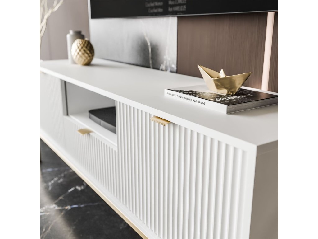 Chcete vytvoriť priestor, ktorý kombinuje eleganciu s funkčnosťou? TV skrinka CORA na zlatých nohách je perfektným riešením!