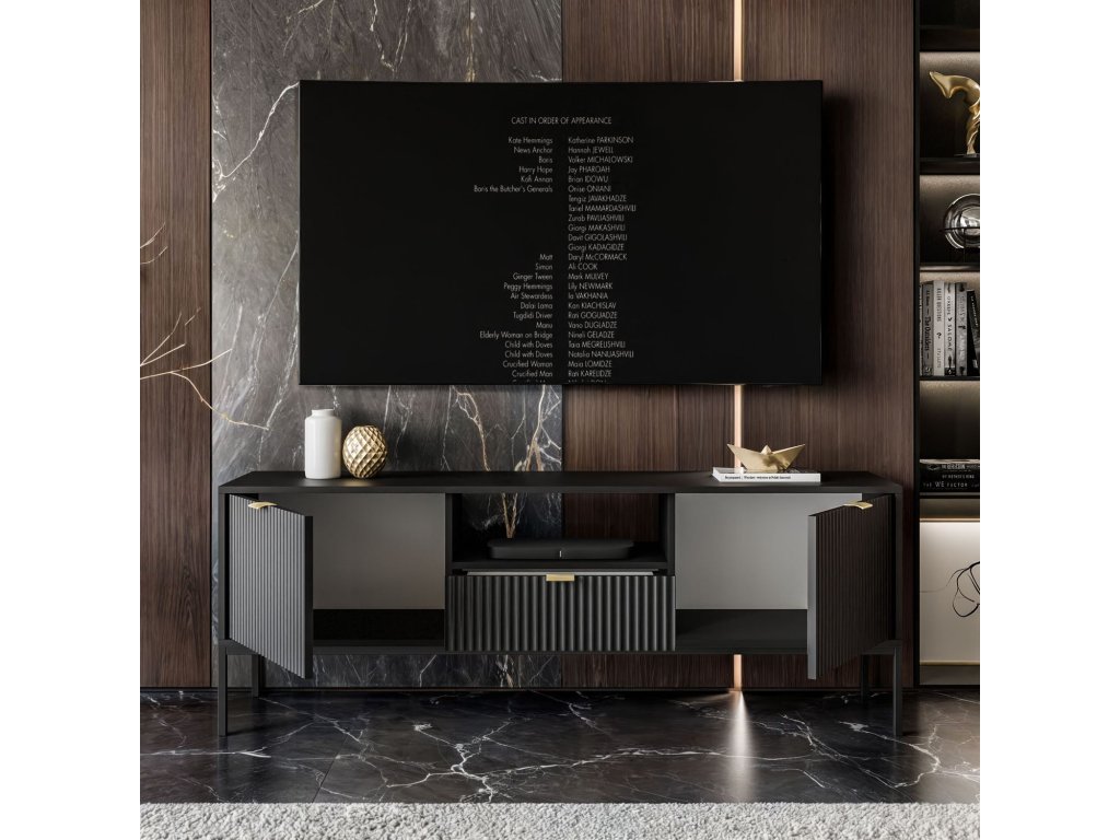Chcete vytvoriť priestor, ktorý kombinuje eleganciu s funkčnosťou? TV skrinka CORA na zlatých nohách je perfektným riešením!