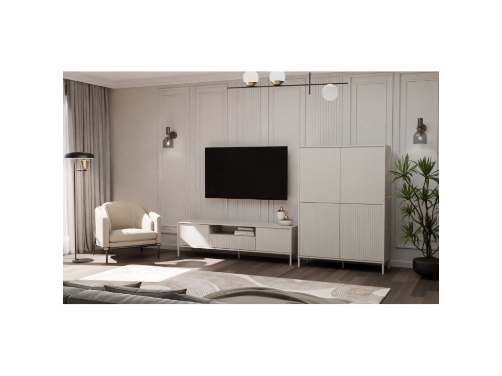 TV stolík Leandra je perfektným riešením pre tých, ktorí si cenia moderný štýl a praktické riešenia. Jeho minimalistický dizajn a drážkované predné strany mu dodávajú jedinečný charakter, zatiaľ čo premyslené usporiadanie políc a skriniek umožňuje pohodlné skladovanie a organizáciu.
