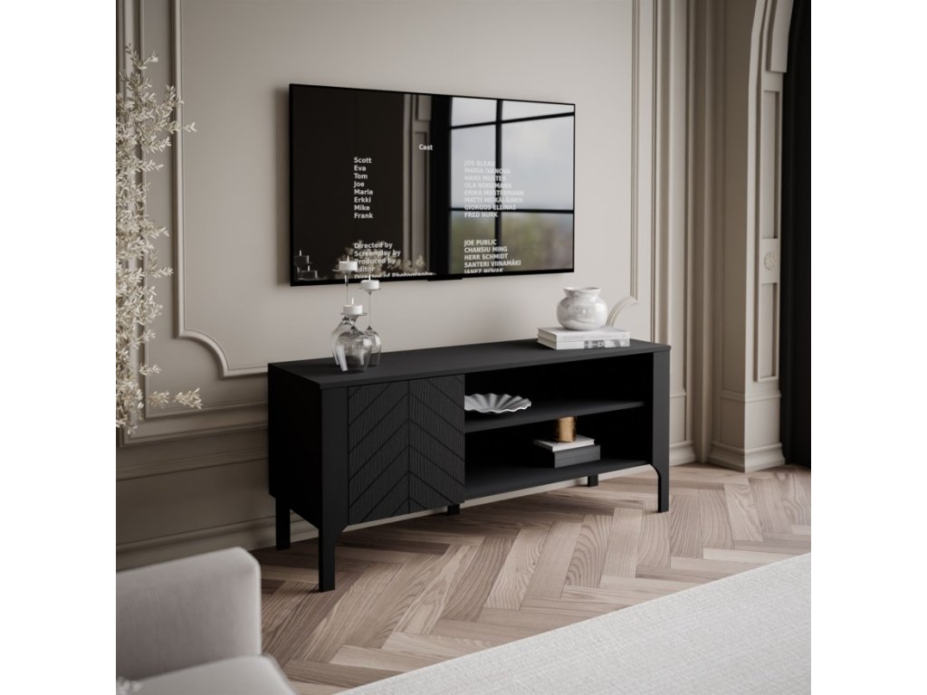 TV stolík MARCIUS s praktickou poličkou je k dispozícii v dvoch farebných prevedeniach. Jeho predné strany zdobí elegantný vzor rybej kosti, ktorý dodáva skrinke jedinečný charakter.