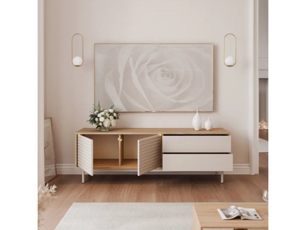 TV stolík QUENTIN so zásuvkami je štýlový a funkčný kus nábytku, ktorý sa perfektne hodí do modernej obývačky. Korpus je vyrobený z odolnej laminovanej dosky odolnej voči poškriabaniu a poškodeniu, čo zaručuje dlhoročnú životnosť. Predné časti z MDF sú zdobené elegantnými drážkovanými vložkami, ktoré zdôrazňujú jedinečný charakter nábytku.