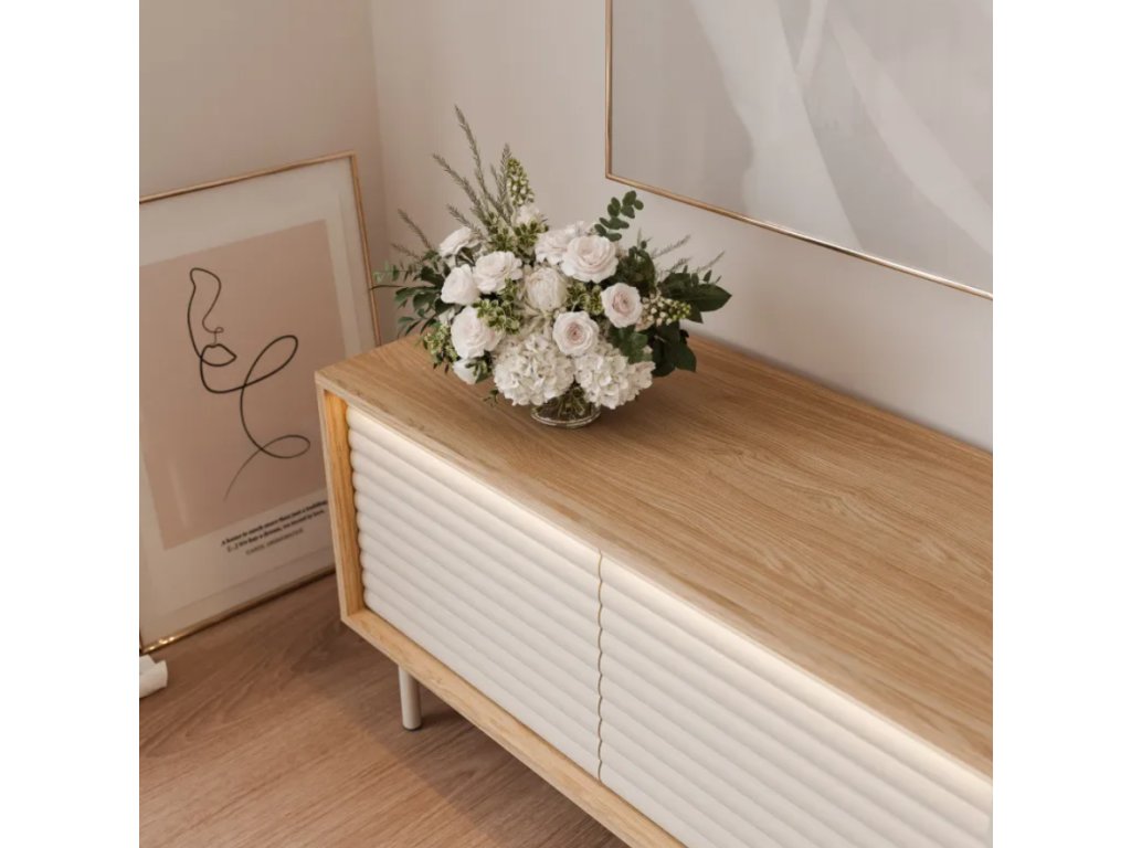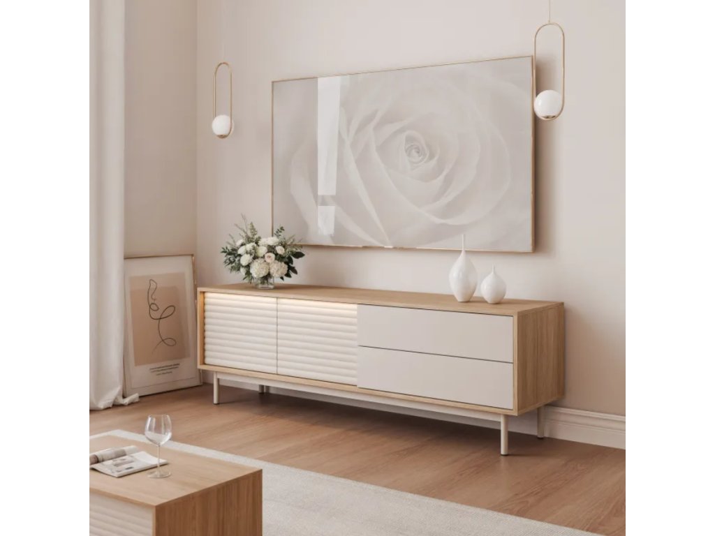 Dve priestranné zásuvky poskytujú pohodlné uloženie diaľkových ovládačov, káblov, diskov a ďalšieho multimediálneho príslušenstva. Systém otvárania jedným stlačením umožňuje jednoduché používanie a zdôrazňuje minimalistický štýl TV stolíka. Štíhle kovové nohy dodávajú stolíku ľahký dizajn a moderný vzhľad a zároveň uľahčujú čistenie pod skrinkou.