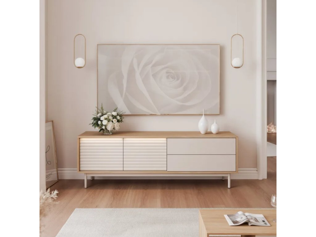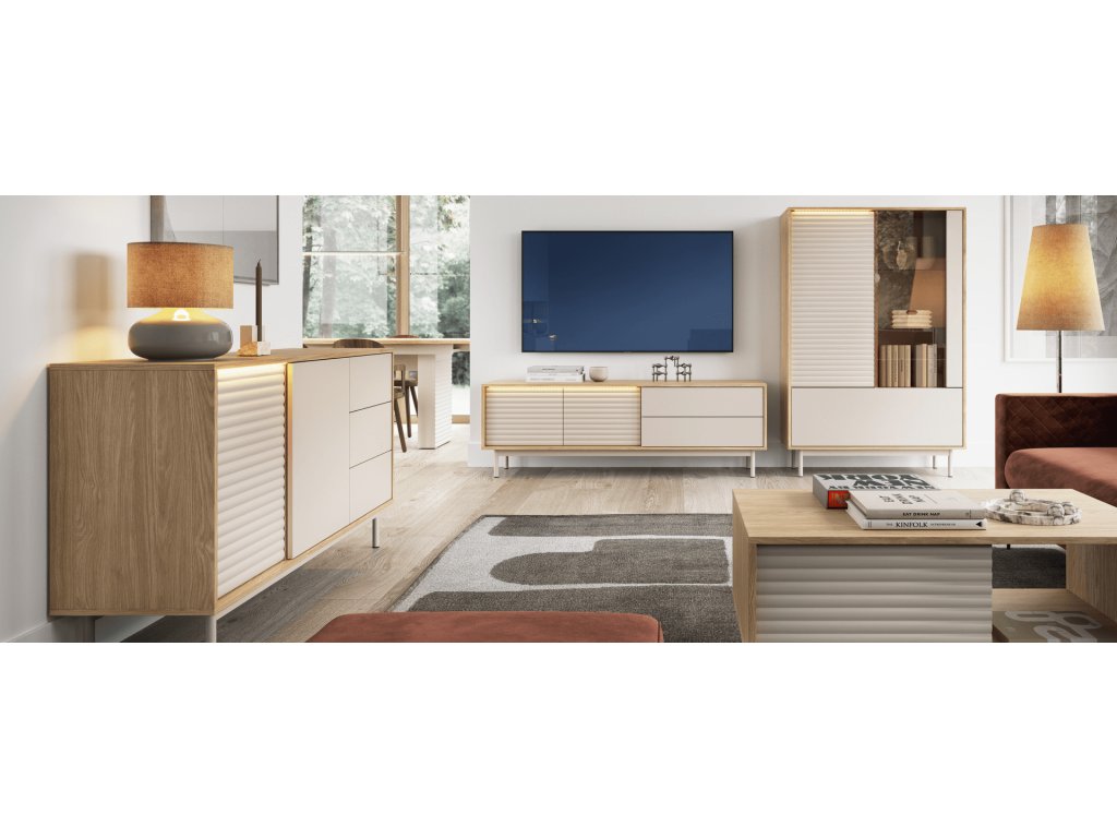 Jedinečnou vlastnosťou TV stolíka QUENTIN je štandardné LED osvetlenie namontované nad drážkovanou prednou časťou . Táto vlastnosť dodáva interiéru útulnú atmosféru a ďalej zdôrazňuje jedinečnú povrchovú úpravu nábytku. Módna farebná kombinácia – moderný olejovaný dub a elegantný kašmír – umožňuje, aby sa stolík bez problémov spájal so svetlými aj tmavšími interiérmi.