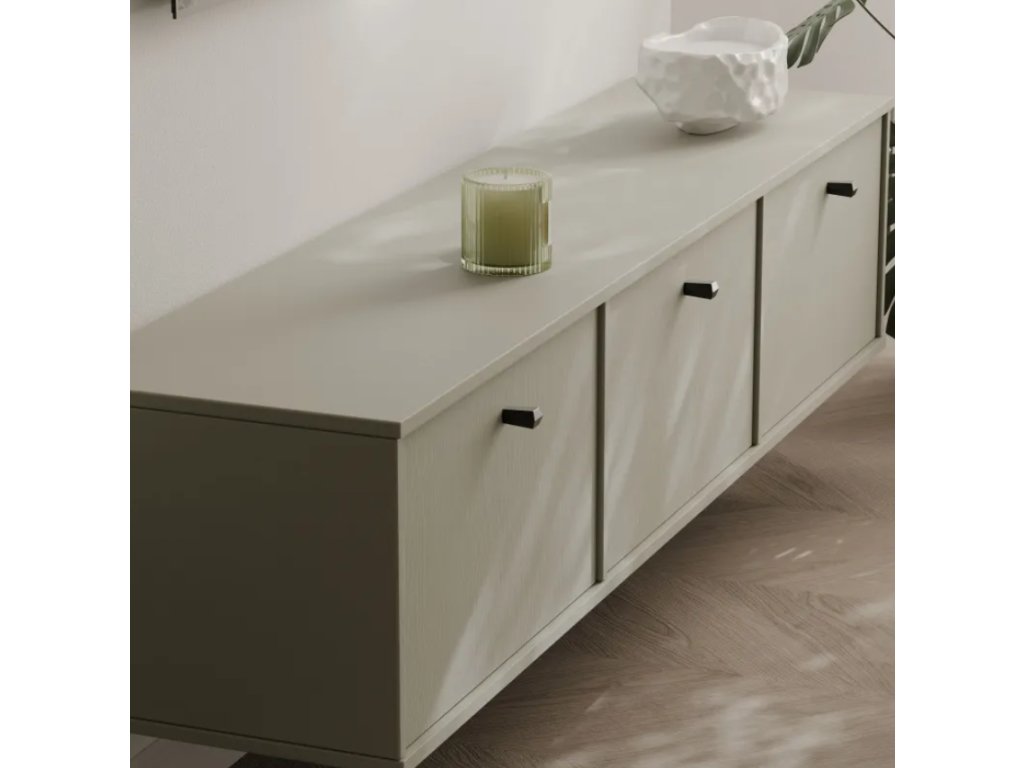 Závesná TV skrinka RAY s dĺžkou 180 cm a tromi praktickými úložnými priestormi kombinuje moderný dizajn s funkčnosťou a ponúka elegantné miesto na odloženie multimediálnej techniky a príslušenstva v obývacej izbe.