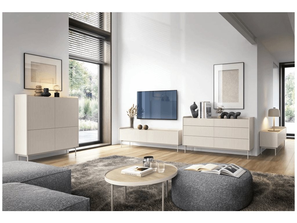 Do tohto trendu dokonale zapadá súprava Wandy s drážkovanými čelami. Kolekcia dokonale kombinuje tlmené, prirodzené farby béžovej a svetlého dreva. Jedinečný štýl nábytku zdôrazňujú zaoblené boky a znížená doska stola vo farbe dub scandi. Harmonickým doplnkom sú béžové kovové nohy, ktoré dodávajú kolekcii ľahkosť. Tento nábytok je symetrický a minimalistický a zároveň originálny a moderný.