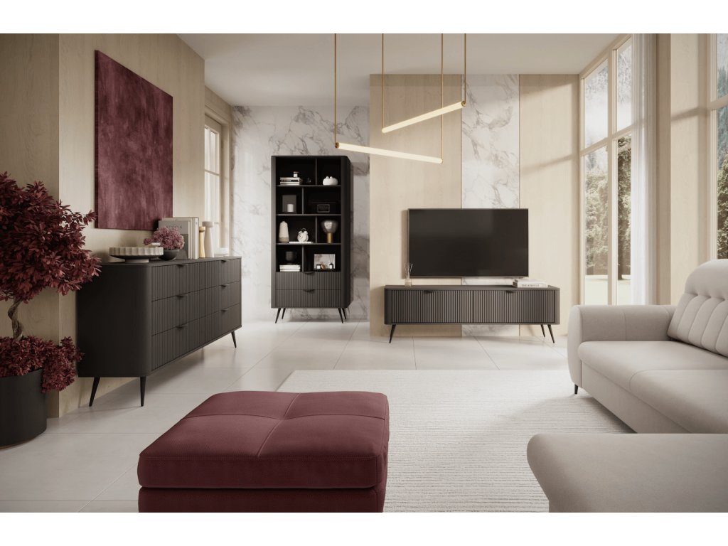 Čierna vnáša do interiéru pokoj a rovnováhu, dokonale ladí so zlatými akcentmi, vďaka čomu je miestnosť útulná a elegantná zároveň. Zaoblené hrany a drážkované čelá dodávajú nábytku modernosť a originalitu.