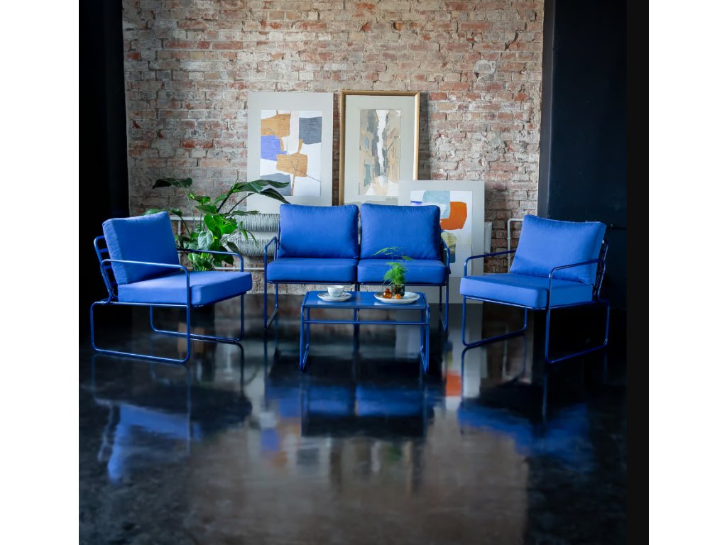 Tento štýlový set obsahuje dve kreslá, dvojmiestnu pohovku a nízky konferenčný stolík s malými otvormi uprostred oceľovej dosky, čo mu dodáva moderný charakter. Otvory v doske stola sú navrhnuté tak, aby umožňovali ľahký odtok dažďovej vody, čo zaisťuje, že doska stola zostane čistá a rýchlo schne. Komplexná ochrana proti vonkajším faktorom, ako je UV žiarenie a vlhkosť, je zaistená použitím práškovo lakovanej ocele v modrej farbe v celej konštrukcii nábytku, vrátane rámov a dosky stola.