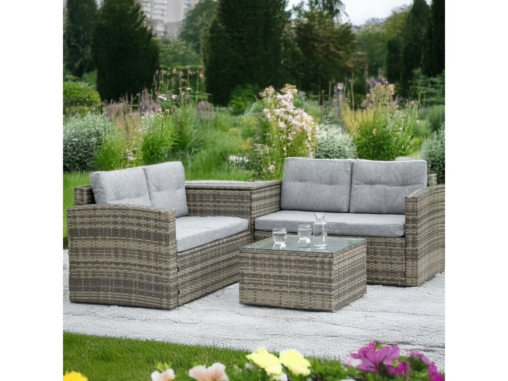 Súprava záhradného nábytku JUDITH , v šedej farbe, je vyrobená z vysoko kvalitného polyratanu - výpletu, ktorý sa podobá prírodnému ratanu, ale výrazne ho prevyšuje z hľadiska mechanickej pevnosti a odolnosti voči poveternostným vplyvom, ako je vlhkosť, špina a UV žiarenie.