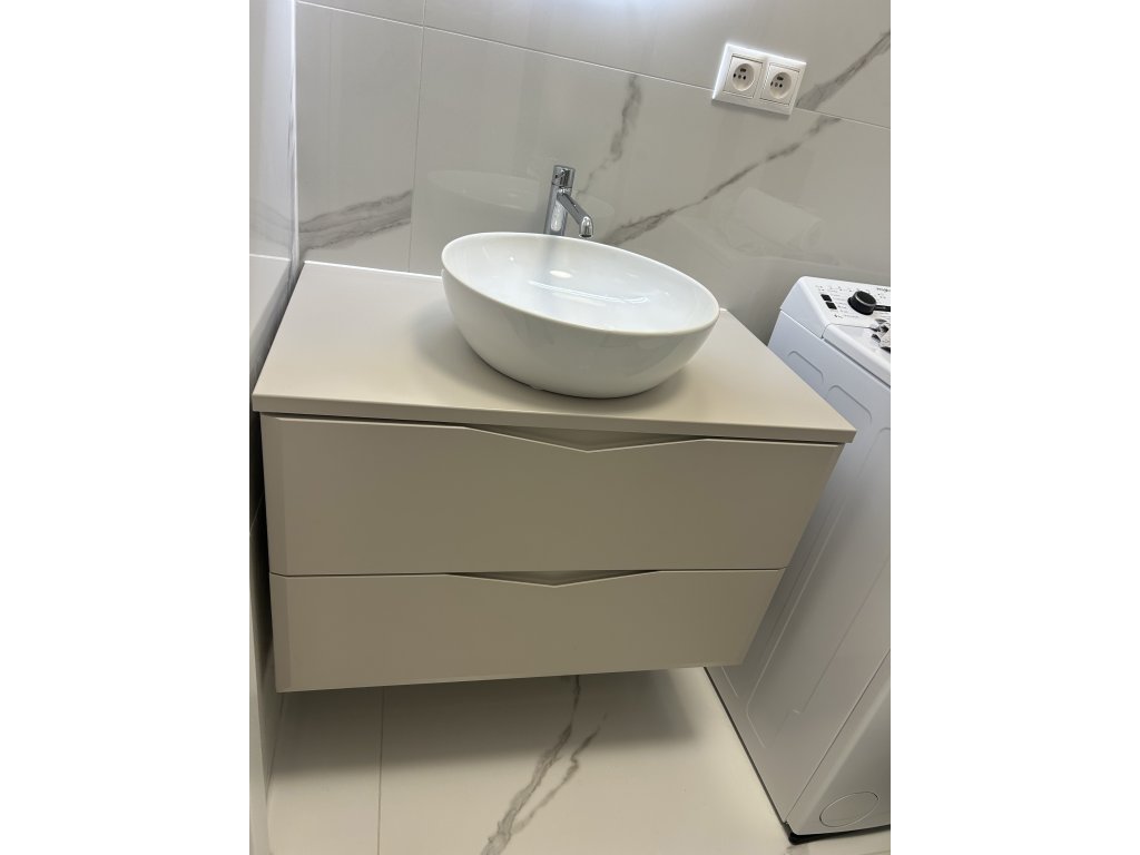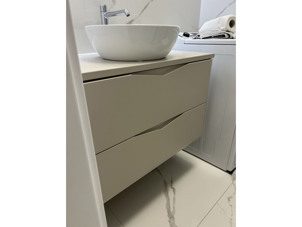 Umývadlo na dosku vyrobené zo sanitárnej keramiky je dokonalým doplnkom zostavy - jeho elegantný tvar a odolnosť vám umožní užívať si krásu vašej kúpeľne po mnoho rokov. Kašmírový odtieň nábytku skvele dopĺňa jemnú povrchovú úpravu umývadla a vytvára priestor plný harmónie.