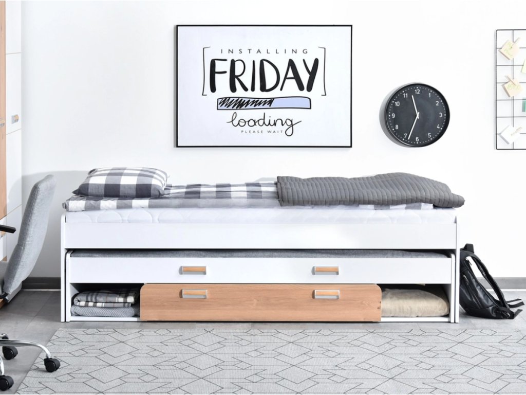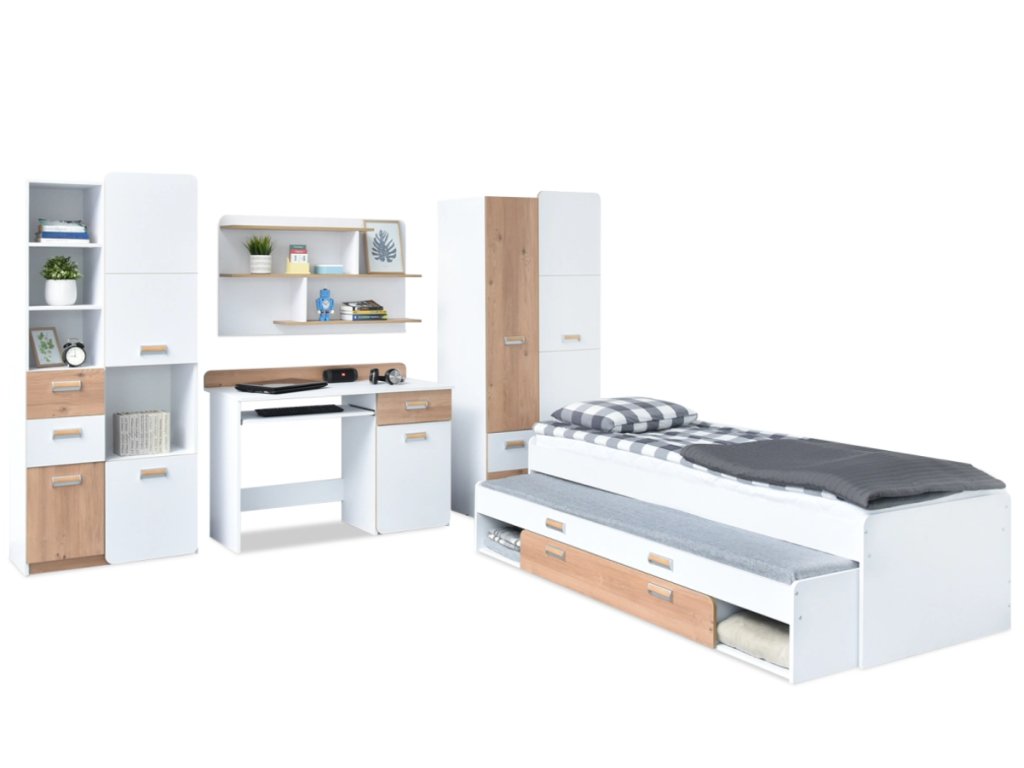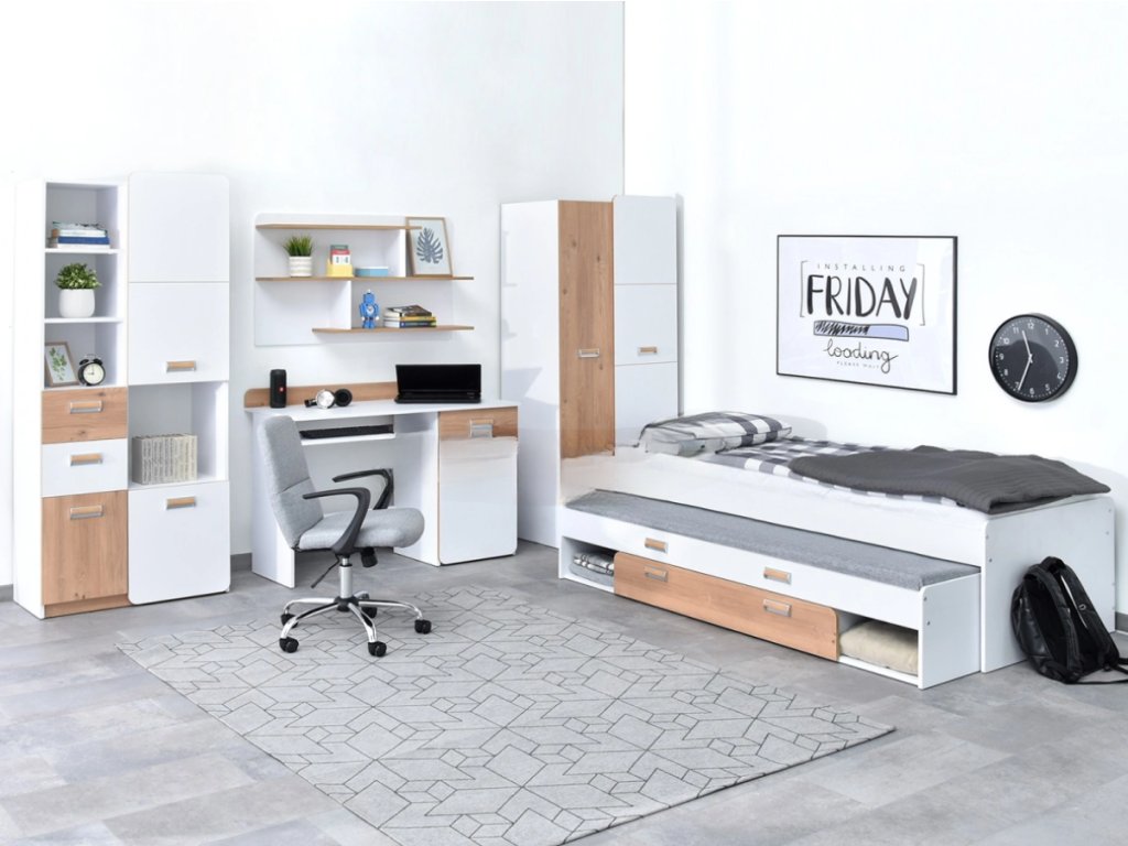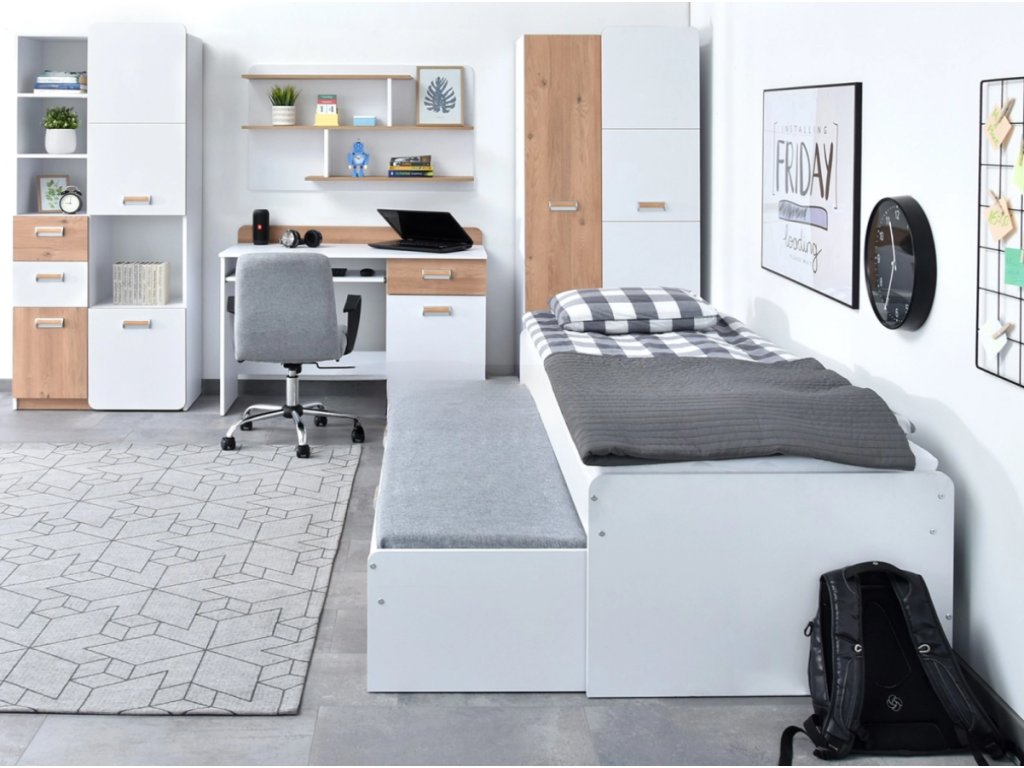Dvojfarebná schéma bielej a dubovej farby je moderná kombinácia, ktorá v súčasnosti kraľuje v mnohých interiéroch. Hlavným prvkom súpravy je dvojúrovňová posteľ C16 s výsuvným spodným matracom. Tento kus nábytku je skvelým riešením pre naše deti, ktoré zdieľajú izbu, alebo keď zrazu potrebujeme ďalšie miesto na spanie. Ďalšou výhodou nábytku je výsuvná zásuvka, ktorá vďaka svojej kapacite môže ľahko slúžiť ako úložný priestor na posteľnú bielizeň. Spodná časť postele bola obohatená o hlboké výklenky , ktoré poskytujú priestor na drobnosti. Súčasťou zostavy je aj dvojdverová skriňa C01 a dvojitá polica C07 - obe jednotky sú vybavené zásuvkami na guľôčkových ložiskách a policami, krytými čelami a priestrannými výklenkami. Písací stôl C10 má veľkú pracovnú dosku, výsuvnú poličku na klávesnicu, priestrannú zásuvku a skrinku - všetko, čo je z hľadiska praktickosti u detského nábytku najdôležitejšie. Horizontálna závesná polica C08 s nepravidelným tvarom bude perfektným doplnkom priestoru nad stolom, umocní dizajnový dojem a poskytne veľa ďalšieho priestoru na tie najpotrebnejšie veci. Vyššie uvedené univerzálne farby vám umožnia zariadiť interiér dospievajúceho chlapca alebo tínedžera, pretože nadčasové farby potešia každého bez ohľadu na vek.